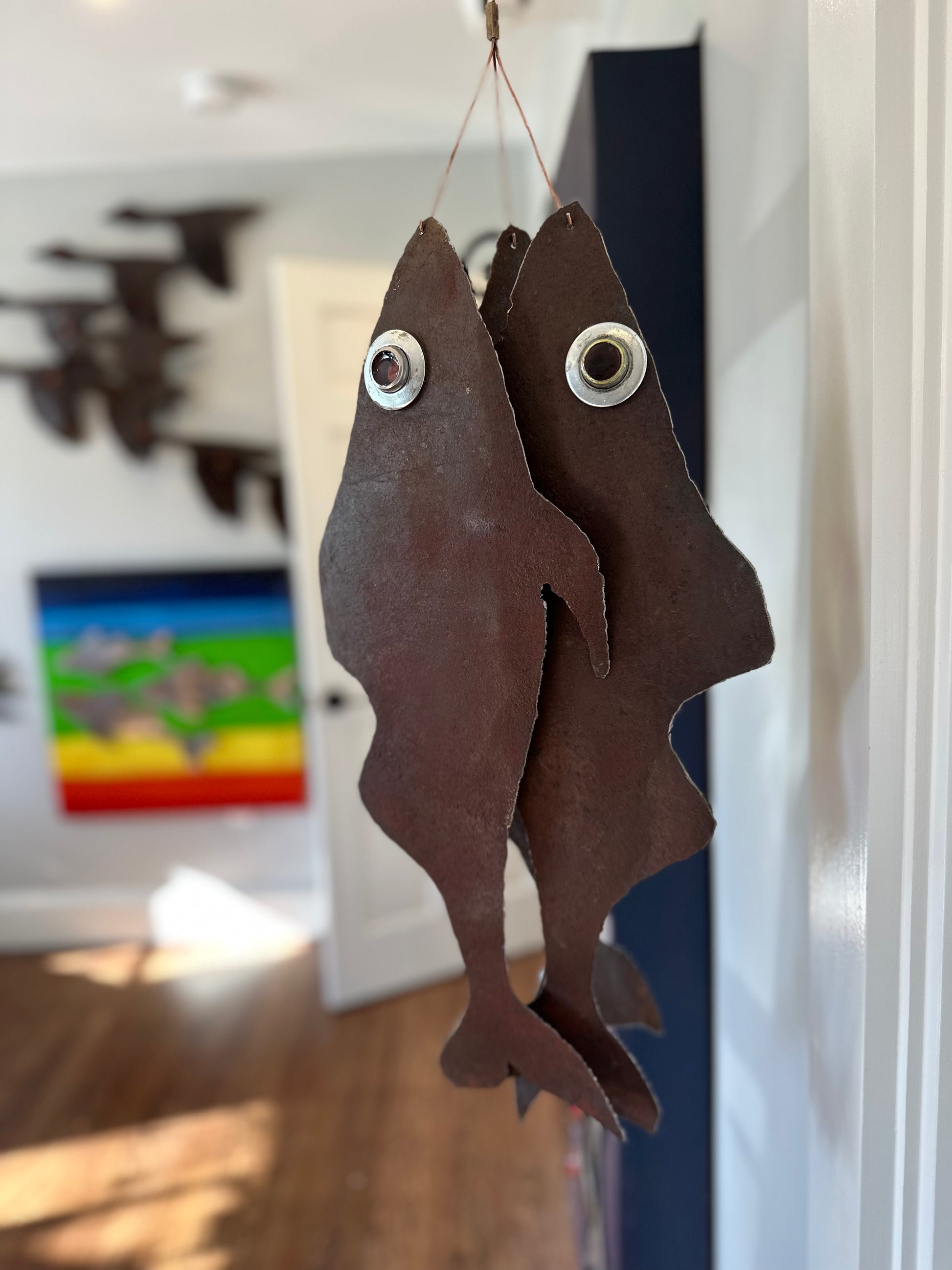 These are our best sellers, individual handcrafted steel or stainless steel fish that hang from a blacksmith bracket with colorful accent. Fish have hardware eyes with resin inserts made to withstand the elements. Our customers have hung their fish in backyards, on decks, in hallways. We can customize fish to any size or type.