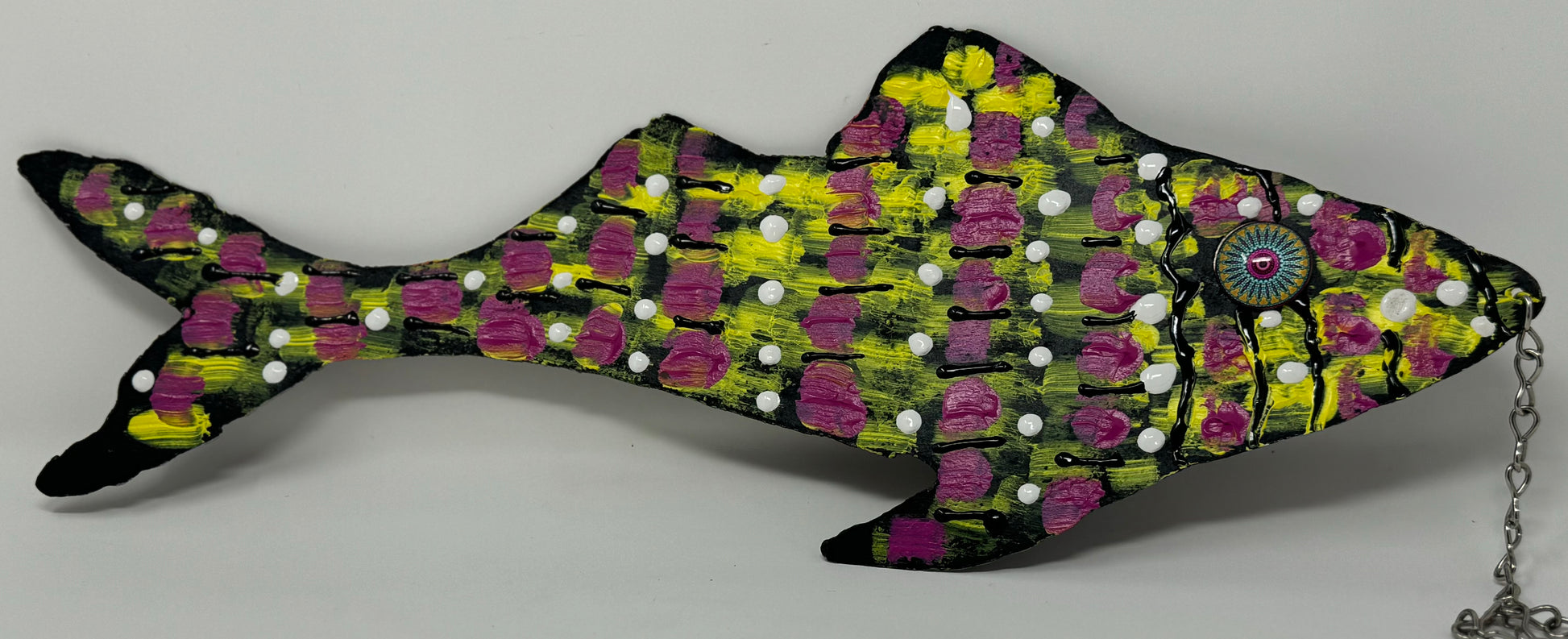 Made of repurposed metal rescued from the landfill, these rustic fish hang from a 6 inch rust proof chain and hook. These one of a kind fish each sport a different hand painted design and were created right in Rockport, with a blacksmith artisan cutting the fish out of metal and a crafter creating each original piece. They can hang in your kitchen, bathroom, yard or anywhere you want cute original nautical art.