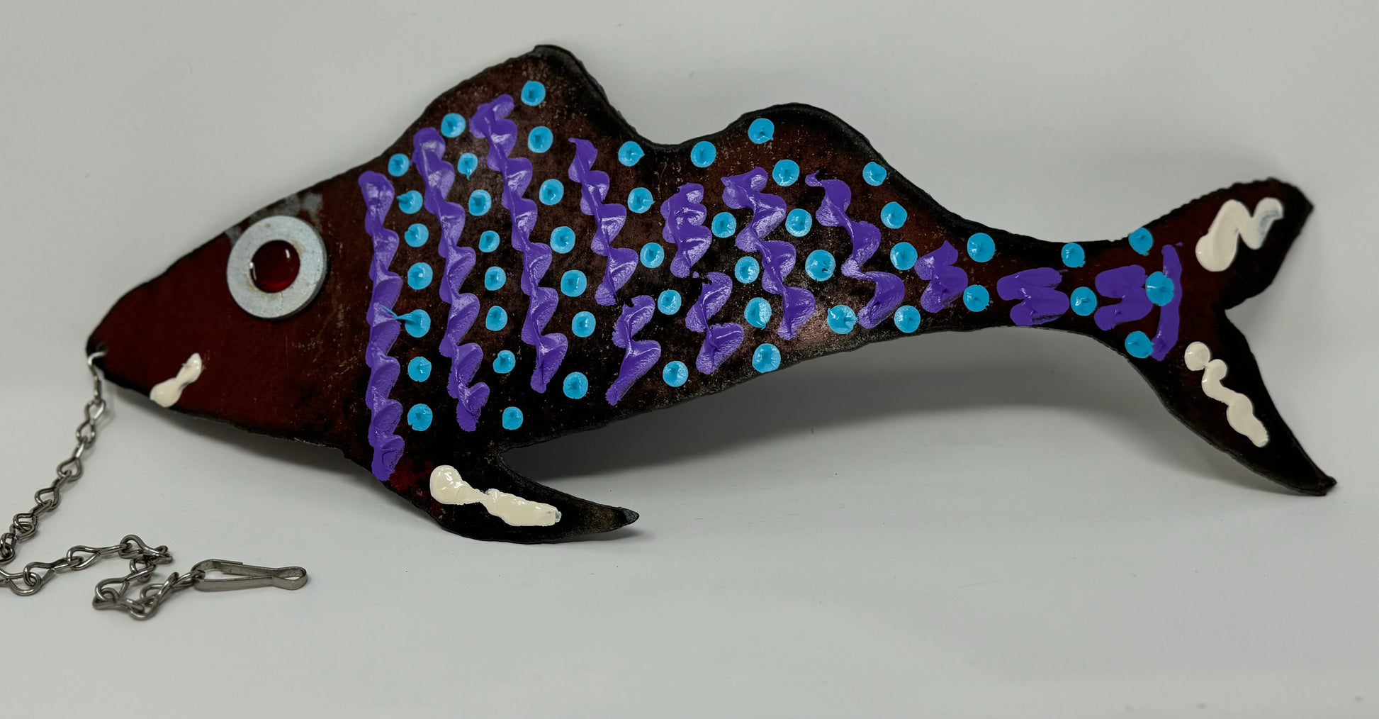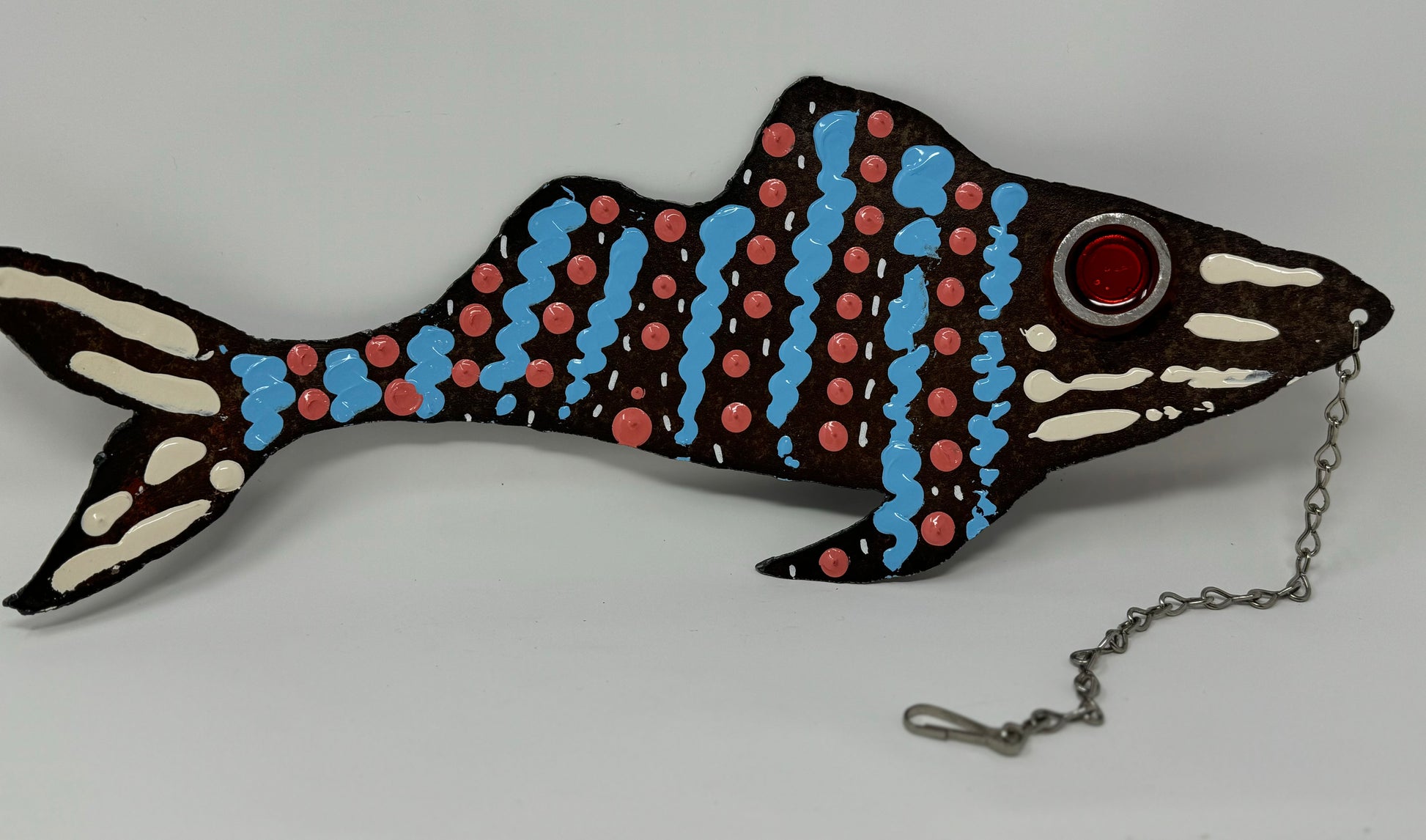Made of repurposed metal rescued from the landfill, these rustic fish hang from a 6 inch rust proof chain and hook. These one of a kind fish each sport a different hand painted design and were created right in Rockport, with a blacksmith artisan cutting the fish out of metal and a crafter creating each original piece. They can hang in your kitchen, bathroom, yard or anywhere you want cute original fishy decor.