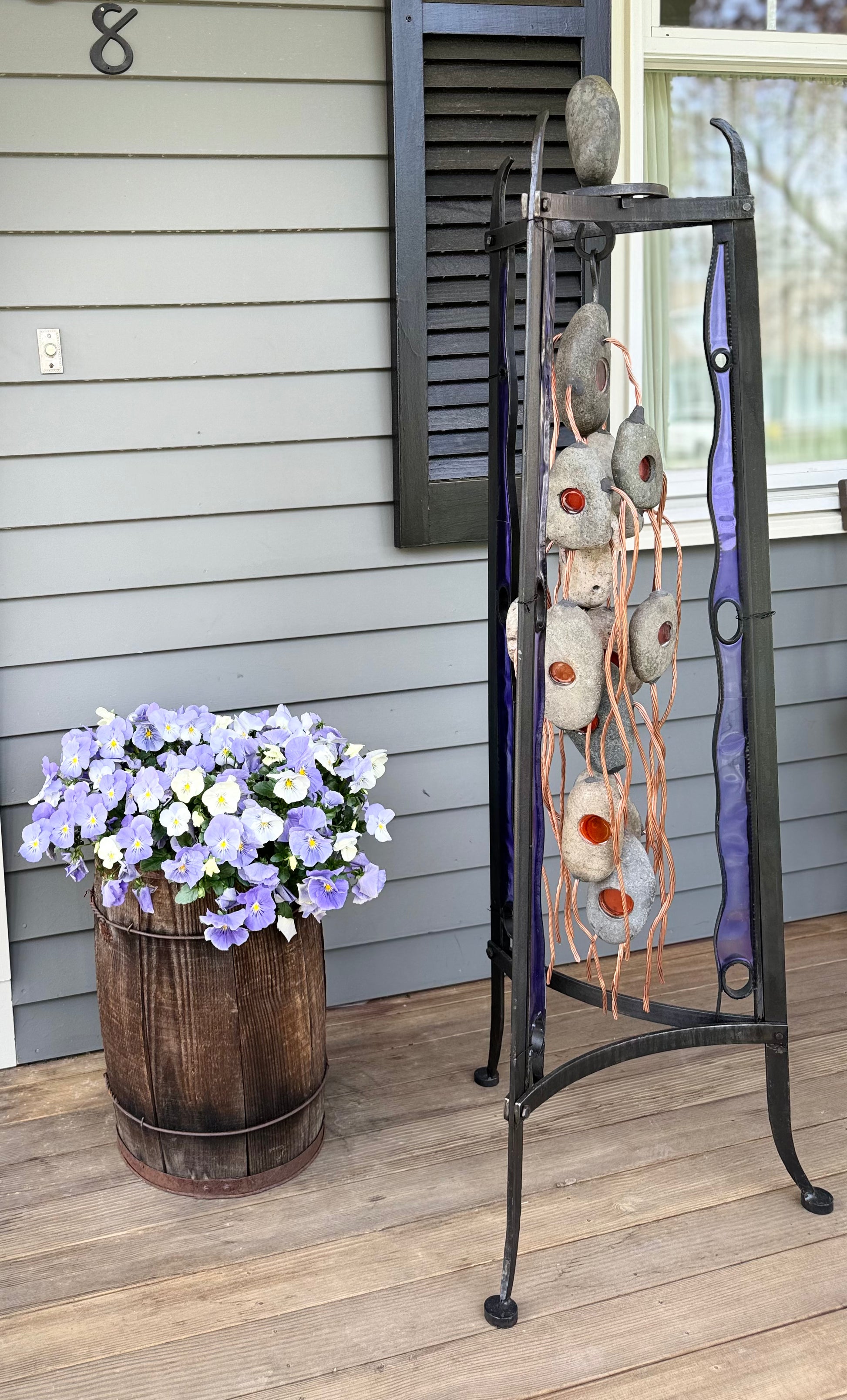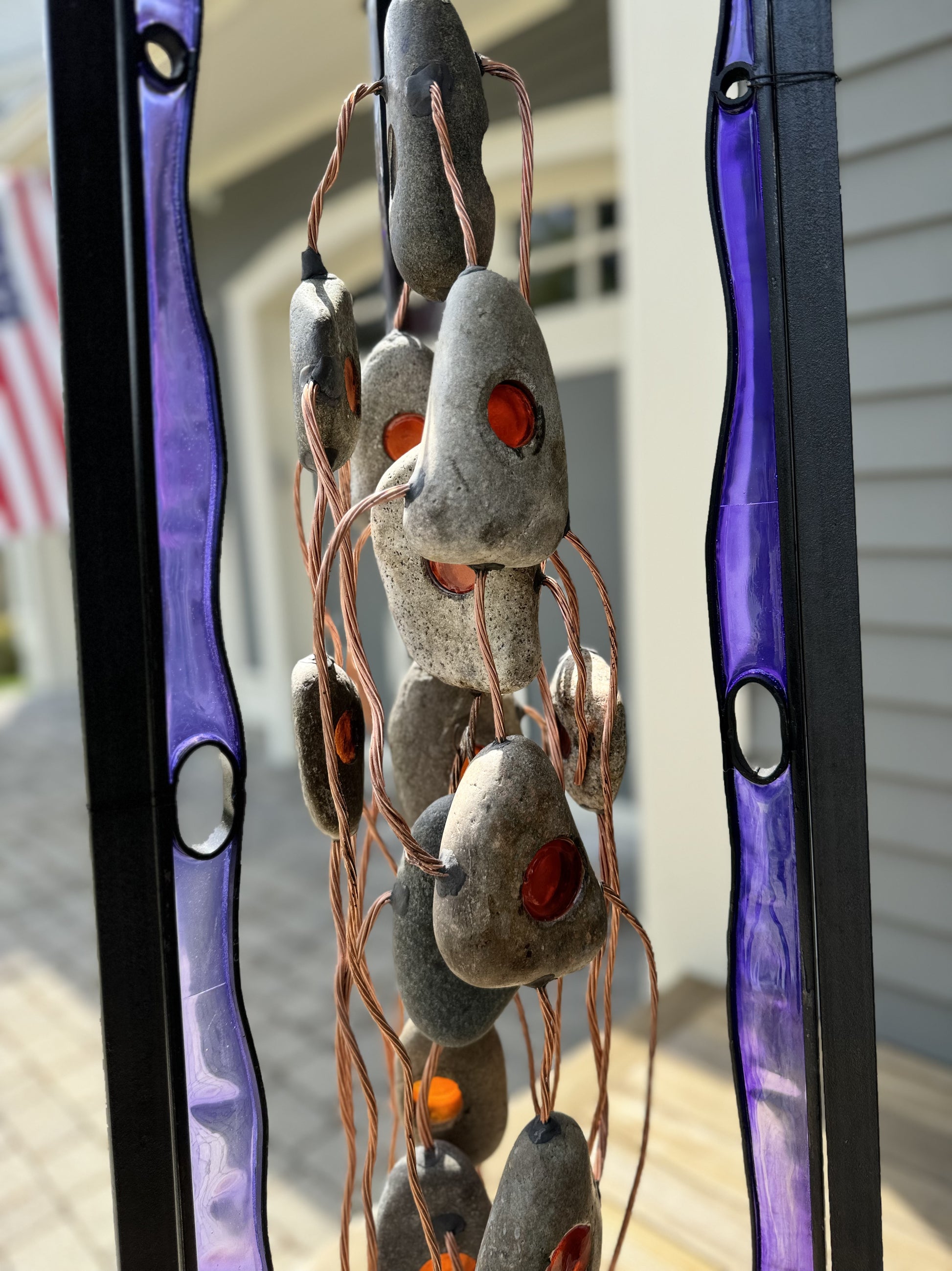 This eye catching garden or patio sculpture is inspired by the inner workings of the brain - synapses and neural pathways. Ocean rocks mimic the cerebral connections and internal brain structure as light glows through the openings of the granite. This stunning steel piece endures the elements or is a striking centerpiece in your lobby or foyer. Carefully blacksmithed and hand forged details took hours to create the frame. This is an heirloom masterpiece that is one-of-a-kind and carries with it the energy of the ocean rocks.