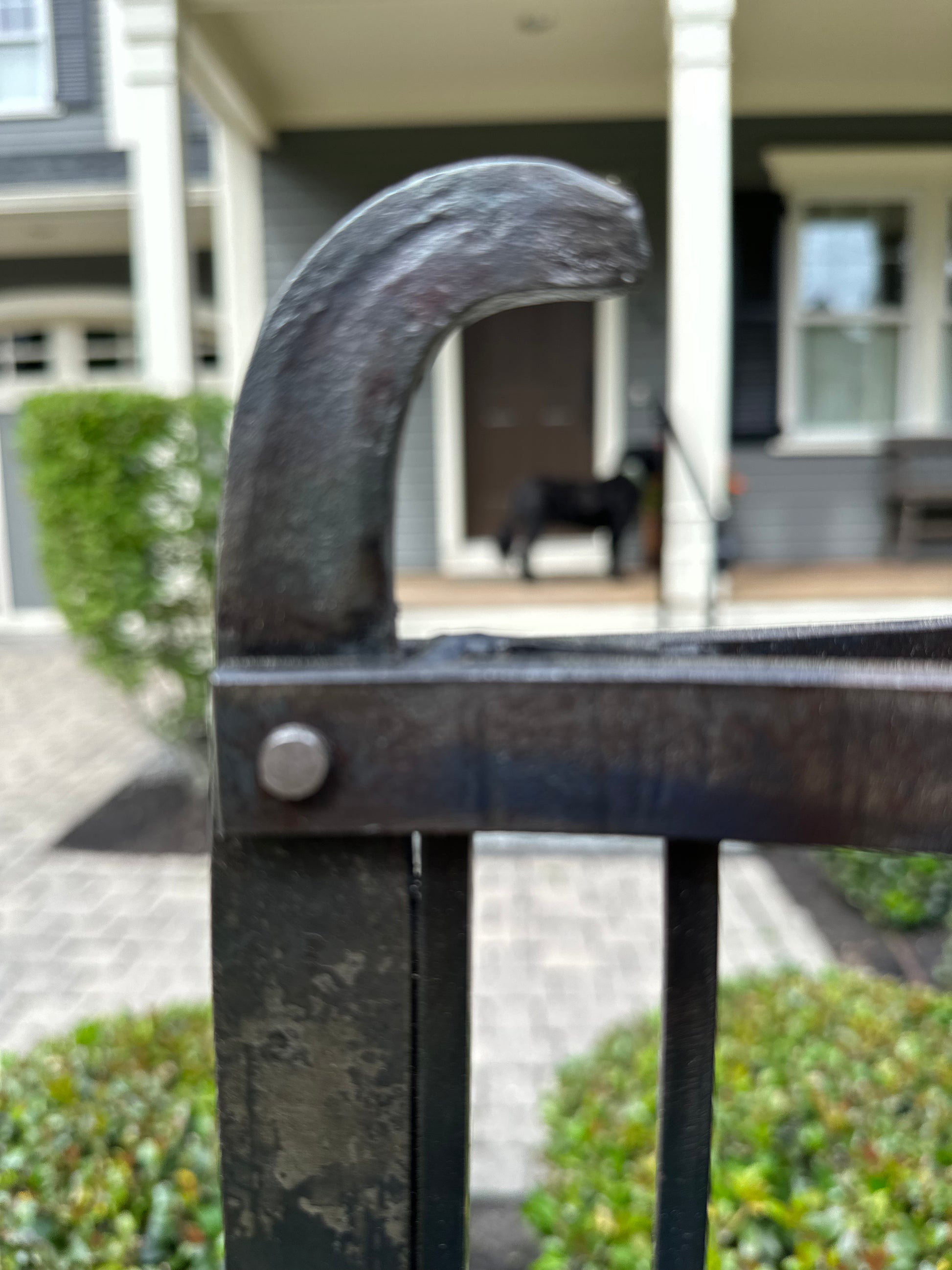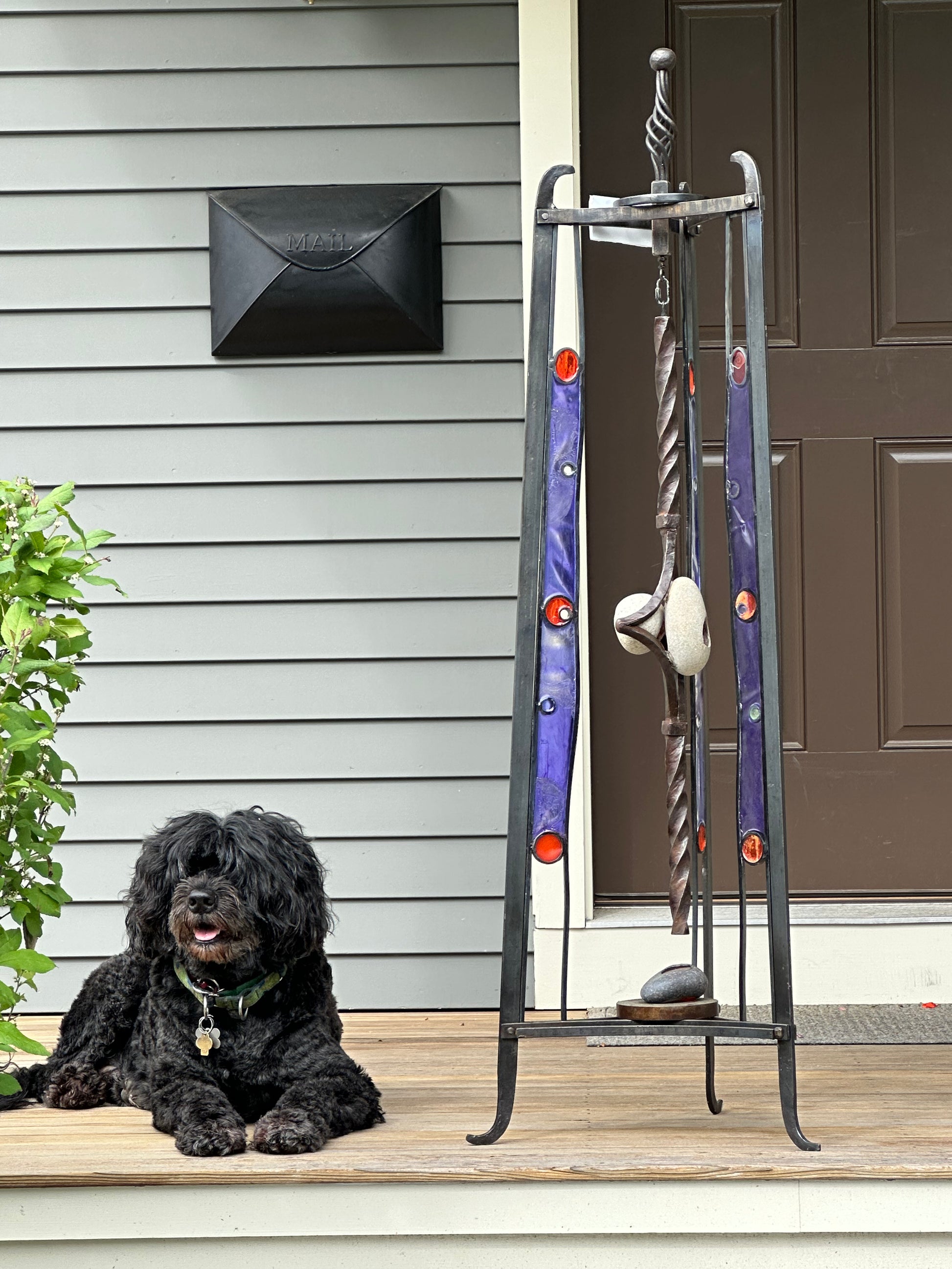 Astro the dog approves of this exquisite metal 'totem.' Endowed with spiritual properties, the triangular shape of this self-standing sculpture exemplifies perfection, unity and importance as the strongest unit in geometry. Blacksmithed and hand crafted, this beautiful piece would be an eye-catching center piece in a living room, foyer or solarium. Made to withstand the elements, this totem would also look striking in a garden or front porch. Details include finial and twisted steel and ocean rocks filled with transparent colorful resin. Purple and orange are yin and yang, with purple echoing nobility and spirituality and orange speaking of energy and warmth.