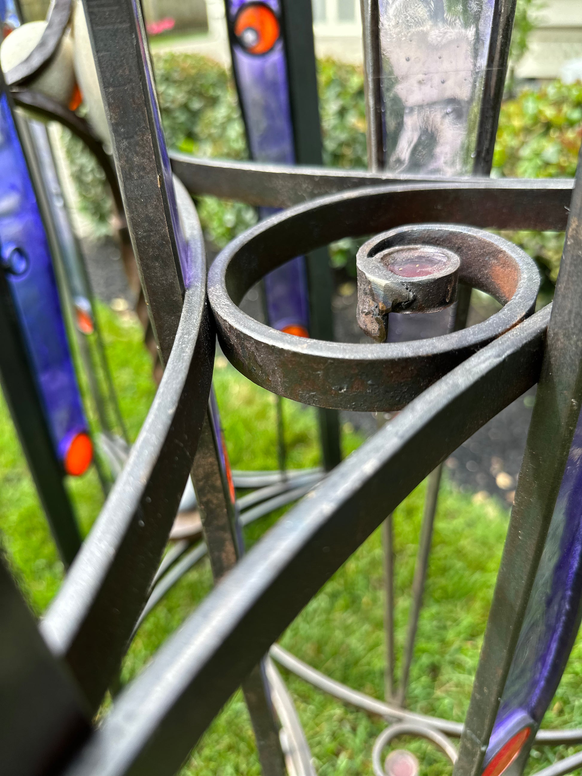 Totems are a spiritual objects that bless the environment they stand in, and this ocean totem is no different. Made of steel with resin accents, this indoor/outdoor sculpture is a sacred addition to any garden or home. Three ocean rocks hang within on strong hand-forged rings, handcrafted on the blacksmith forge. This totem is one-of-a-kind and durable and stable no matter what the weather. Perfect accent for a garden pathway or as a focal point of a oceanside patio or lobby.