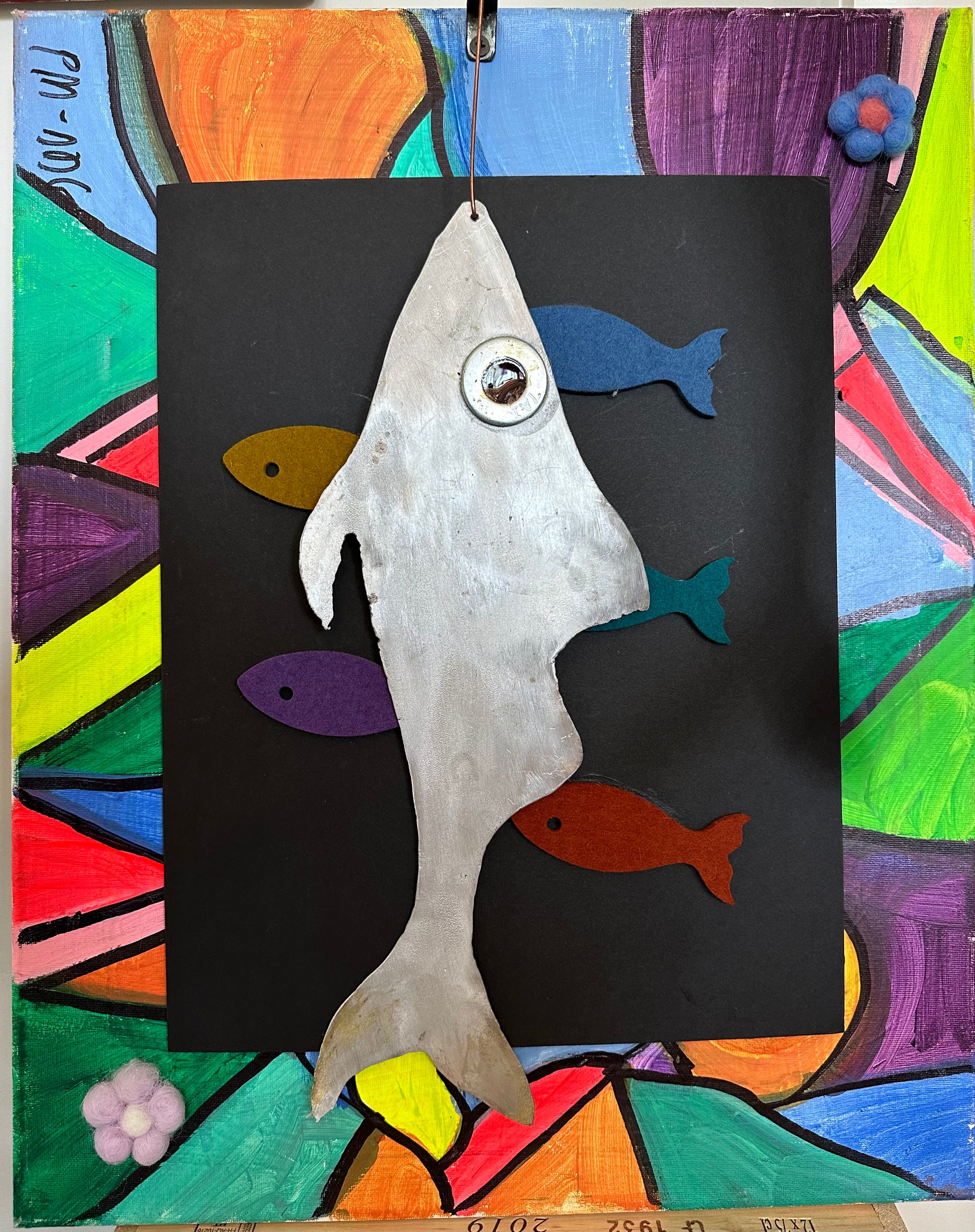 This mixed media piece combines colorful geometric shapes on canvas with felting and a handmade stainless steel fish. You won't have to fish for compliments when you display this vivid artwork in your home or office. One-of-a-kind, handcrafted in Rockport.